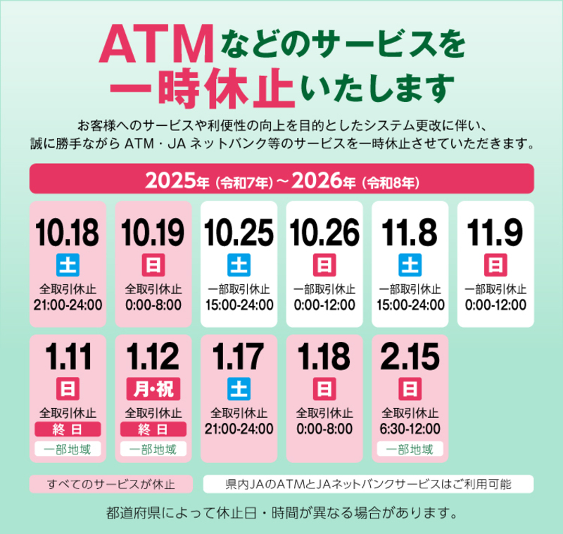お知らせ「ATMなどのサービス一時休止のご案内」の記事