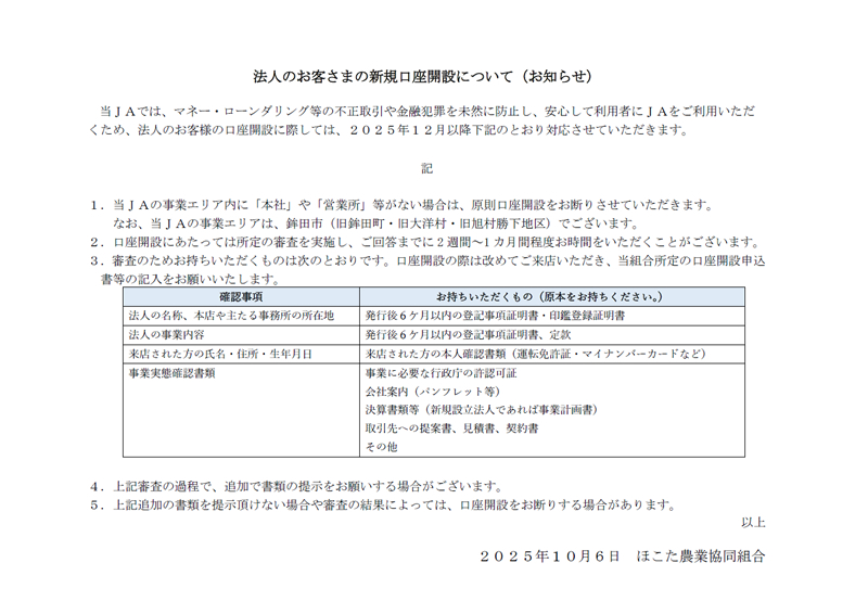 お知らせ「法人のお客さまの新規口座開設について」の記事