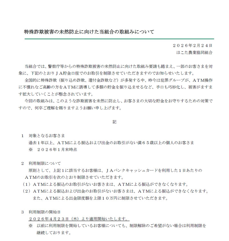 特殊詐欺被害の未然防止に向けた当組合の取組みについて
